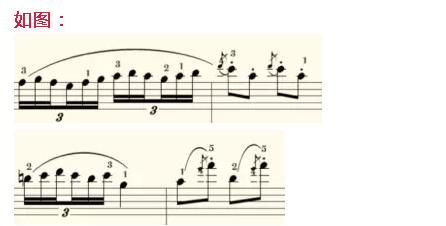 第二行的后两小节与第三行的最后一小节,虽然右手的旋律分别为四个和两个音的小连线,但在处理第一个音的落和最后一个音的跳的方法是相同的,即有