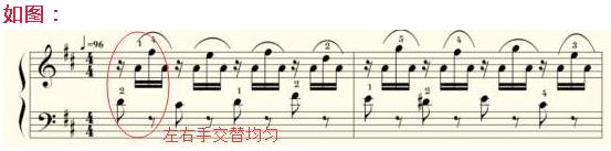 类似这种训练两手连接配合的曲子,都有一个共同的难点—— 均匀。均匀主要包括两个方面,一是连接上的时值均匀,二是连接中的力度均匀。力度的不均匀可能发生在左右手之间,也可能是右手的手指之间。