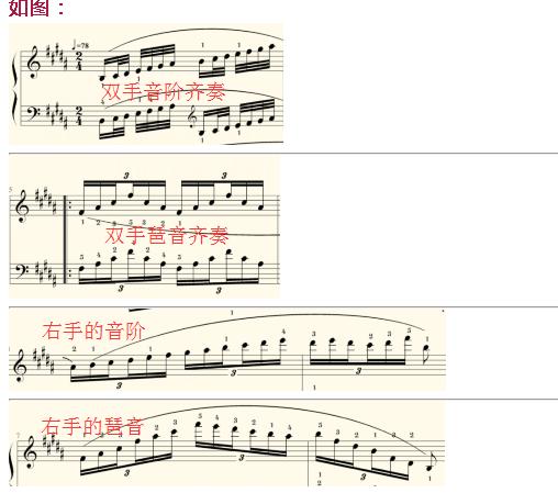 本曲虽然只是短短的八小节,却综合了各种弹奏技法,包括双手音阶齐奏、双手琵音、右手的音阶与琵音等。