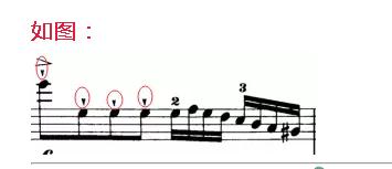 2、在这里老徐想扩展一点点,因为我们在这个阶段肯定还会再遇到另一种跳音记号,那就是倒三角"▼"。演奏该音时值的四分之一。