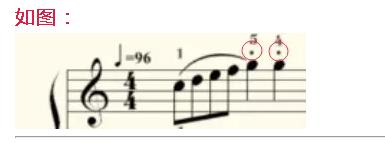 1、在某个音的上面或下面打了一个圆点,我们应用断奏的方法来弹奏,在弹奏时音在短促。跳音的时值约为原时值的一半。